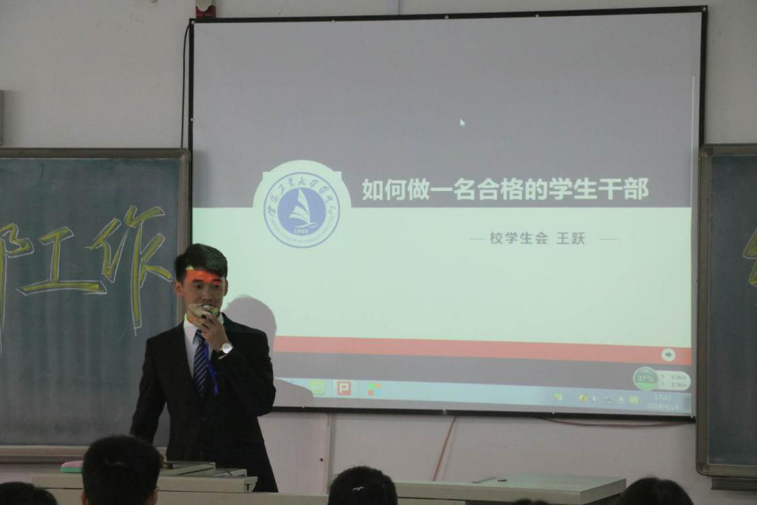 2018年4月25日晚上六点在教学楼C-103,举办了学生干部培训会,中心邀请了管理学院团委副书记杨曼、校学生会副主席张尧,建筑与土木工程学院校学生会主席王跃就如何做一名优秀的学生干部进行了精彩的演讲,中心学生会主席王常成同学也对我们的团委学生会组成进行了介绍,最后团委书记冀录老师对此次大会进行了总结。